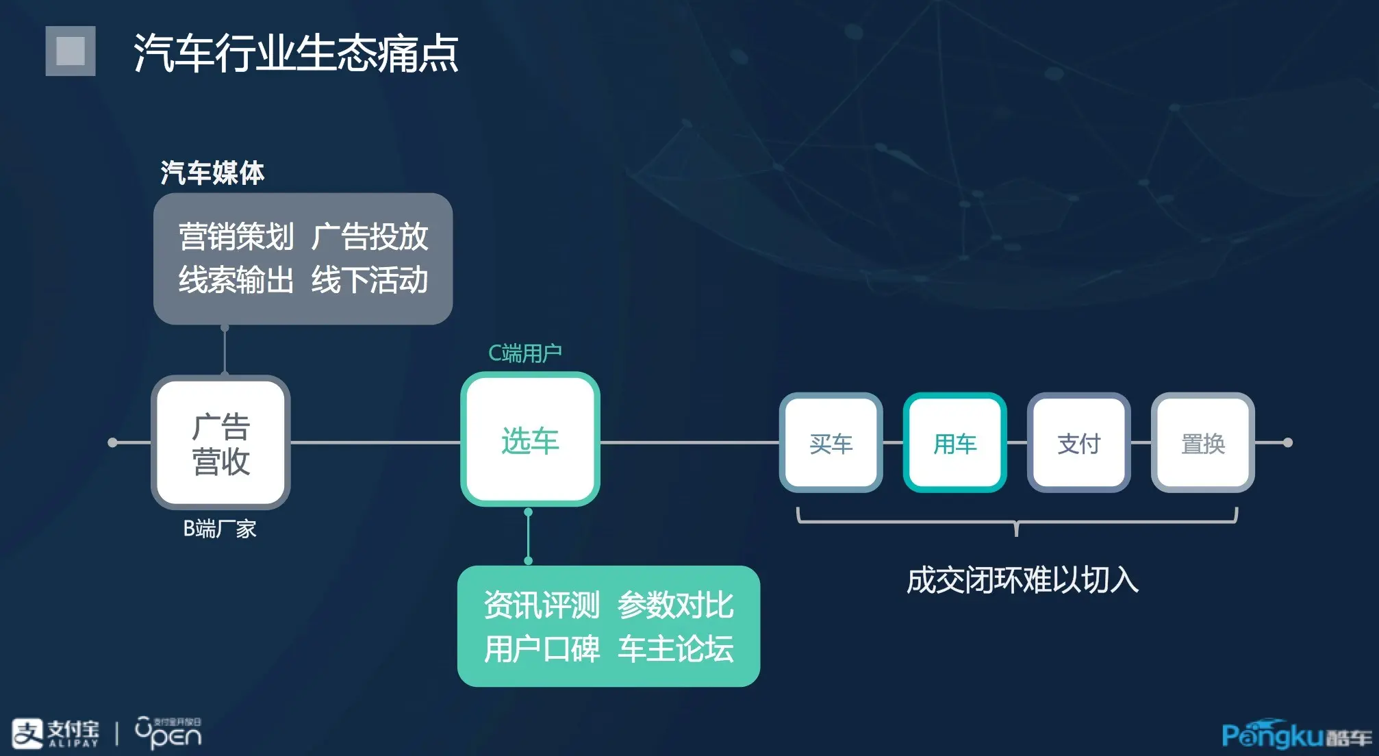 汽车销售生态是一个空间巨大的市场,包括汽车文化、汽车金融、汽车IT等,涉及的产业链悠长、生态玩家众多,但同时也是资源相对分散、细分行业相对割裂的。在中国汽车高速发展的近20年中,每一个领域的玩家,也都面临着各自多年难以解决的痛点。