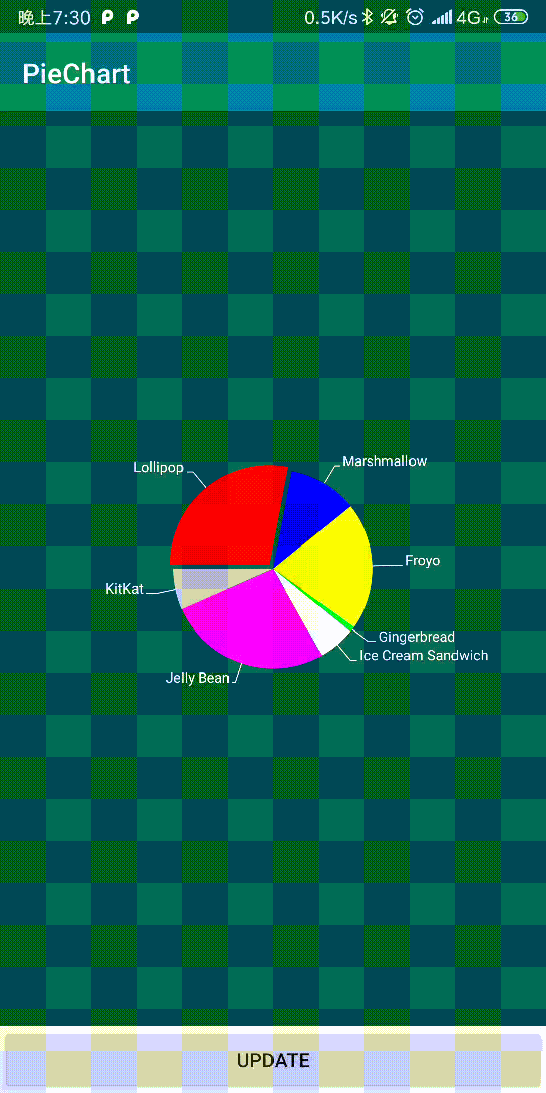 list.add(new PieChartView.Part("Froyo", random.nextInt(100) + 1, Color.YELLOW));