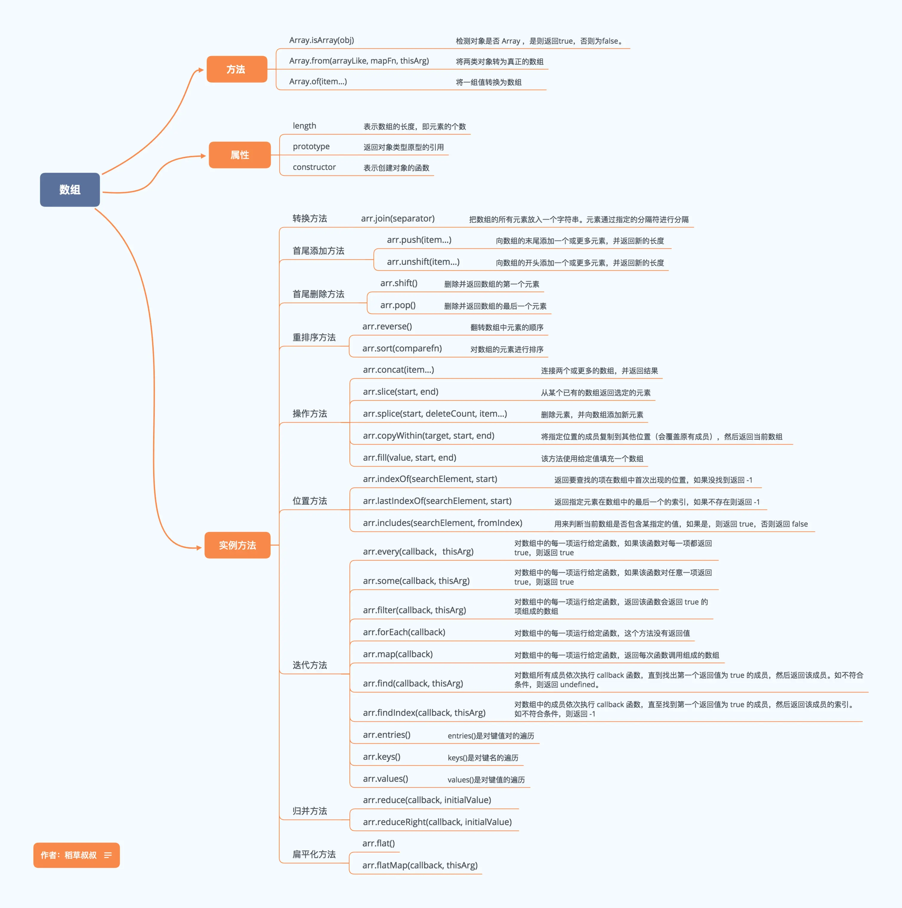 这张图是我收藏的数组方法图,上面列出了常见的数组方法及解释,界面很舒服,应该一看就懂。
