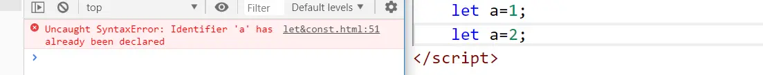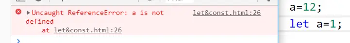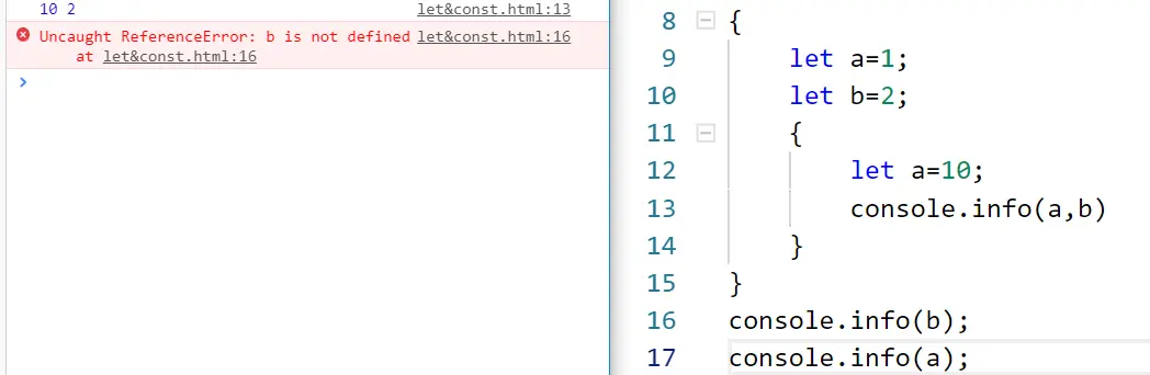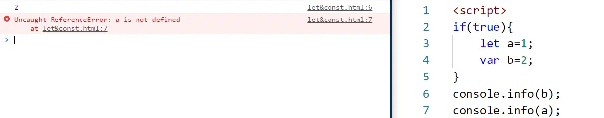 - 上面的代码中,let 定义的变量只在{ }范围内有效,出了{ }就无效了。也可以去掉if