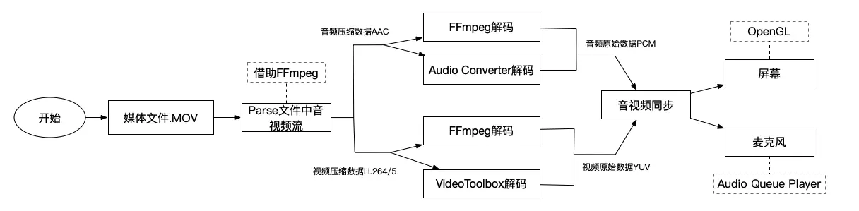 本文以解码一个.MOV媒体文件为例, 该文件中包含H.264编码的视频数据, AAC编码的音频数据,首先要通过FFmpeg去parse文件中的音视频流信息,parse出来的结果保存在AVPacket结构体中,然后分别提取音视频帧数据,音频帧通过FFmpeg解码器或苹果原生框架中的Audio Converter进行解码,视频通过FFmpeg或苹果原生框架VideoToolbox中的解码器可将数据解码,解码后的音频数据格式为PCM,解码后的视频数据格式为YUV原始数据,根据时间戳对音视频数据进行同步,最后将PCM数据音频传给Audio Queue以实现音频的播放,将YUV视频原始数据封装为CMSampleBufferRef数据结构并传给OpenGL以将视频渲染到屏幕上,至此一个完整拉取文件视频流的操作完成.