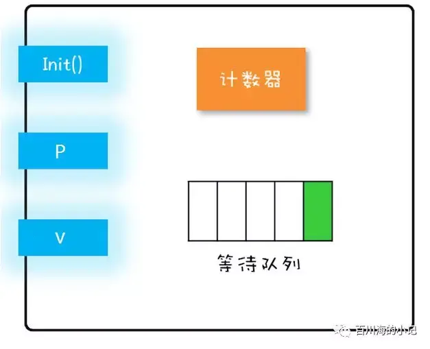 这个黑框,我们定义为一个或一组临界资源具有互斥性的范围,黑框的边界即是临界资源访问的边界。我们将整个黑框看作一个对象,内部定义一个计数器,一般称为信号量,一个等待队列,对外定义了三个操作,分别是Init,P操作与V操作。很多资料都不将Init初始化这个动作视作为一个对外的操作,信号量模型的重点主要在于PV操作。