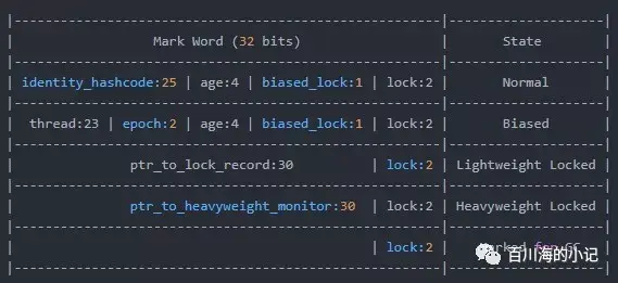 上面提到Java的synchronized关键字就是典型的MESA管程模型的应用,现在可以回过头来讨论这一个话题了。Java中的synchronized关键字,无论是修饰在什么位置,本质上都是依据一个特定的monitor作为互斥标识进行互斥操作的(编注:在1.6版本以前,synchronized关键字都是以此方式实现,在1.6以后,随着synchronized的优化,monitor主要用于重量级锁的实现),这个monitor取自于对象的内存定义:在JVM的对象头定义中,以1个字宽长度(编注:32位/64位JVM分别占用32/64 bit)存储Mark Word,在Mark Word中包含monitor对应的互斥量指针。下面是Java1.6后的Mark Word的内存基本接口示意表格,注意重量级锁的定义: