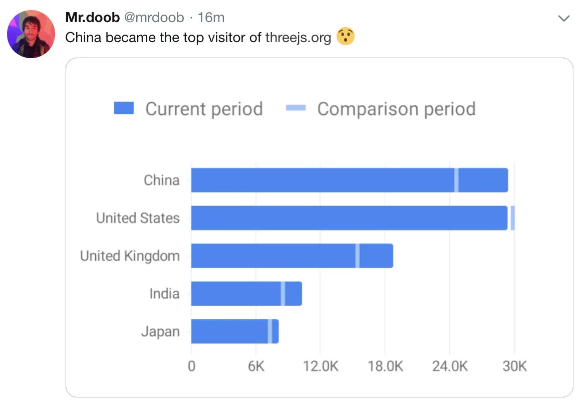 Three.js 的创始人 Ricardo 前几天发布推特称,上个月访问 three.js 官网的中国 IP 第一次超过了美国,中国成为了上个月访问 three.js 人数最多的国家,其次是美国、英国、印度、日本。当然,撇开本身的人口基数不谈,有人猜测这次中国的登顶可能与 three.js 官网中文文档的完善有关。