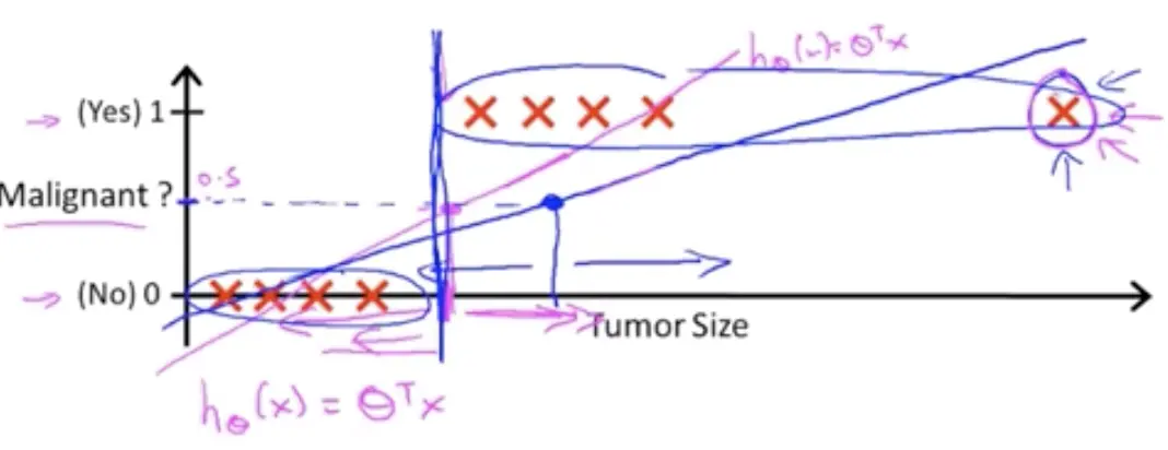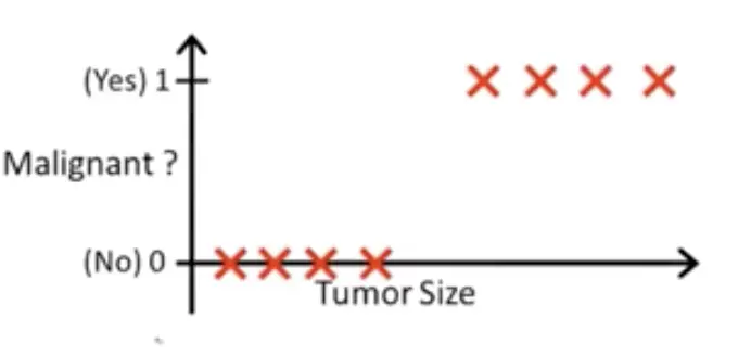 假设有下面数据集合,它表示对于不同的肿瘤大小(tumor size),病人患癌症的概率: