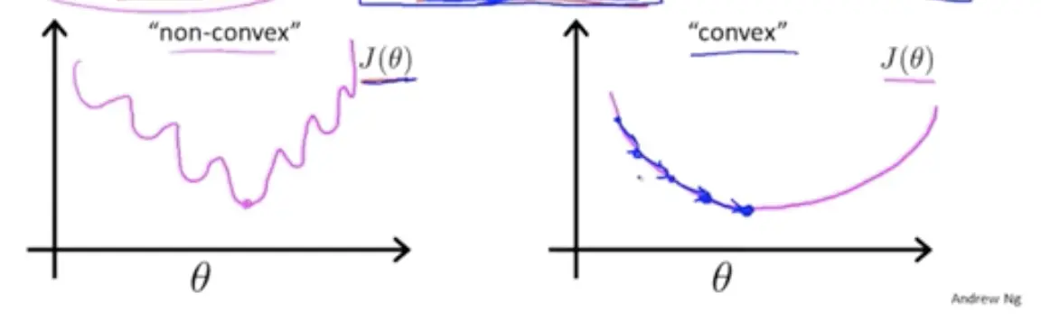 但是它的代价函数的图形为下凹的波浪状,这样波浪状的代价曲线会使我们在做梯度下降的时候陷入迷茫,任何一个极小值都有可能被错认为最小值,但无法获得最优预测精度。但在右图的代价曲线中,就像滑梯一样,我们就很容易达到最小值: