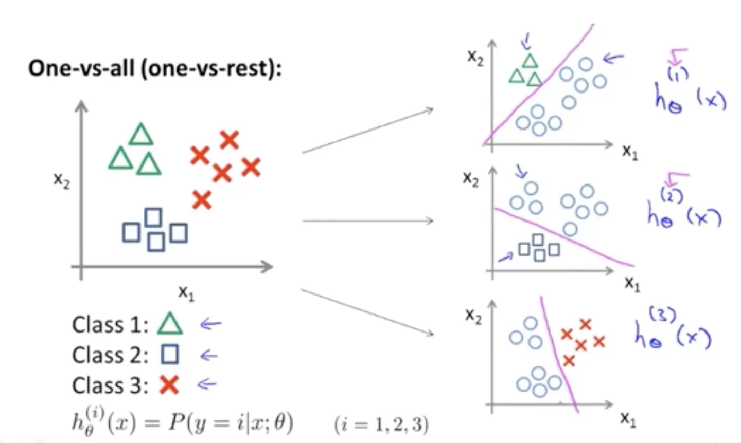 即有几个类别我们就要训练几个逻辑回归分类器,上图需要实现3个分类器,他们满足: