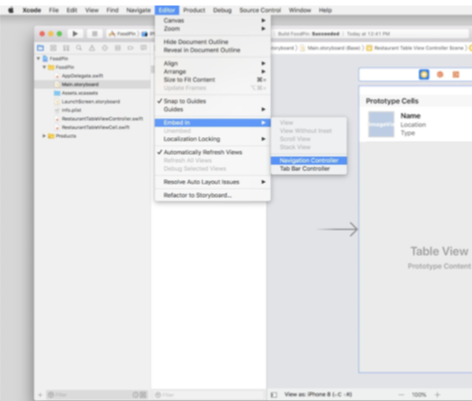 Xcode有个很好用的功能方便你嵌入任意一个视图控制器在navigation controller中。 选中Main.storyboard并切换到Inertface Builder,在选中table view controller 并点击菜单中的Editor。选择Embed in > Navigation Controller