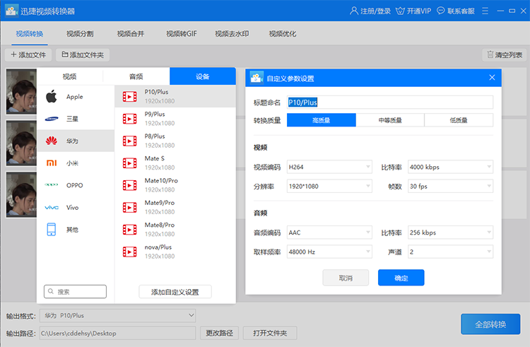 五、视频参数设置好之后,点击“确定”按钮,跳回到原来的主界面,此时我们需要设置文件的输出目录,也就是转换之后的文件存储位置,设置好之后,点击右下角的转换按钮,即可开始转换。