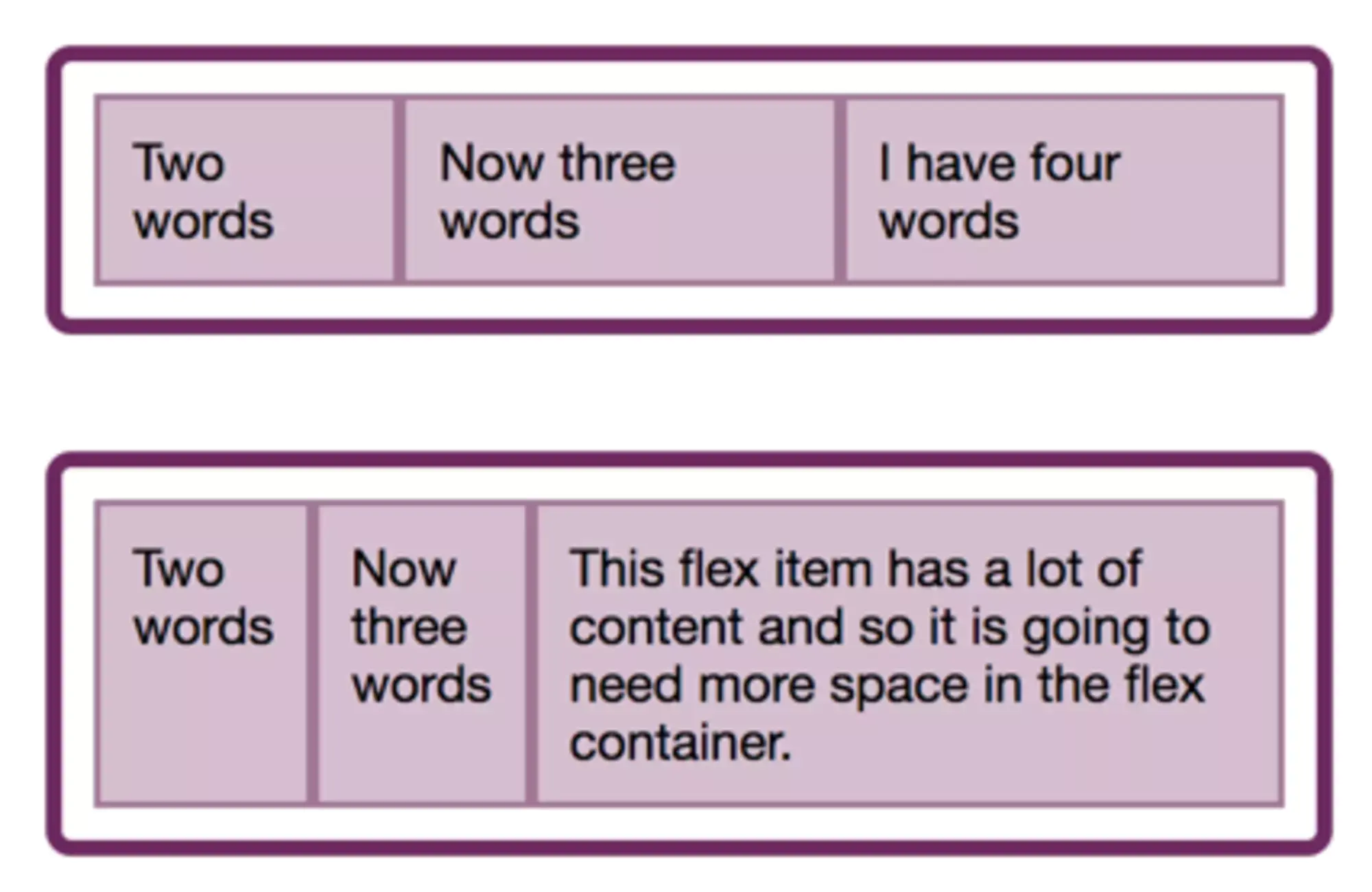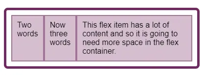 为了默认能够得到很好地布局,flex-basis 初始值使用了 auto。我会在以后的系列文章中解释这个属性的行为。你可以暂时把它认为是“大小刚刚好”(big enough to fit the content)。从页面表现上看的话,就是内容较多的那个项目分配到的空间会比内容少的要多。