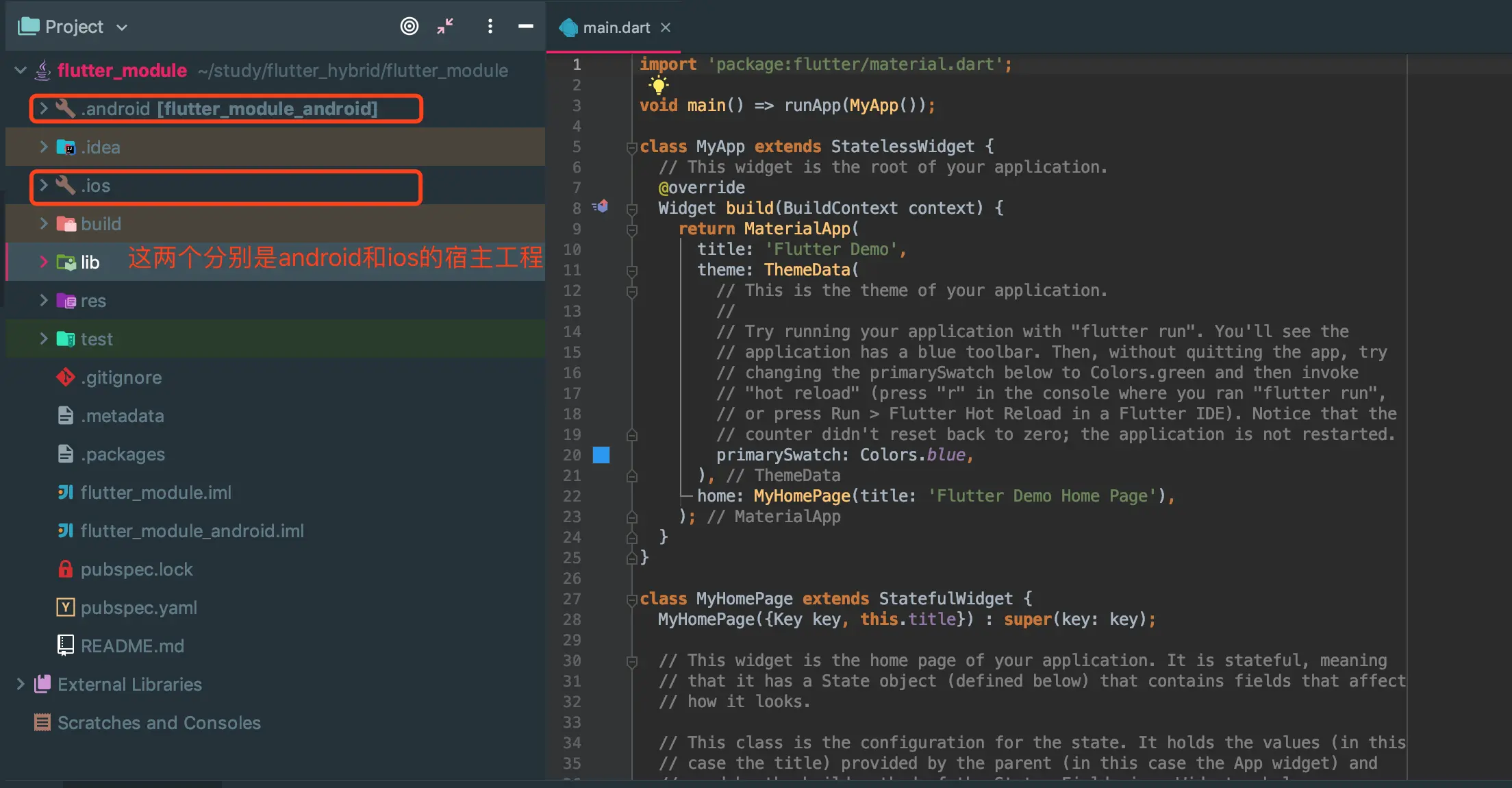 flutter create -t module flutter_module通过命令创建flutter_module 项目,创建好后,flutter_module的目录结构如下: