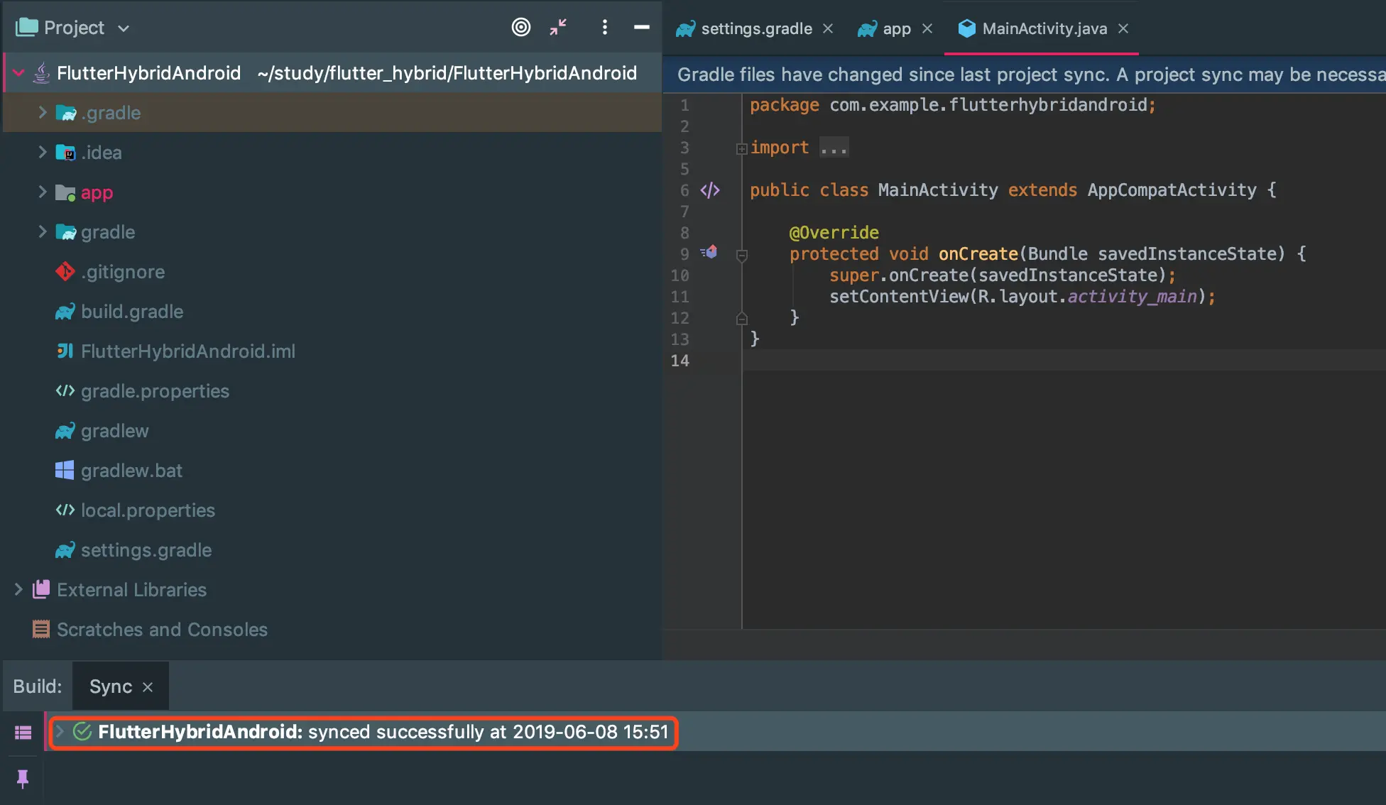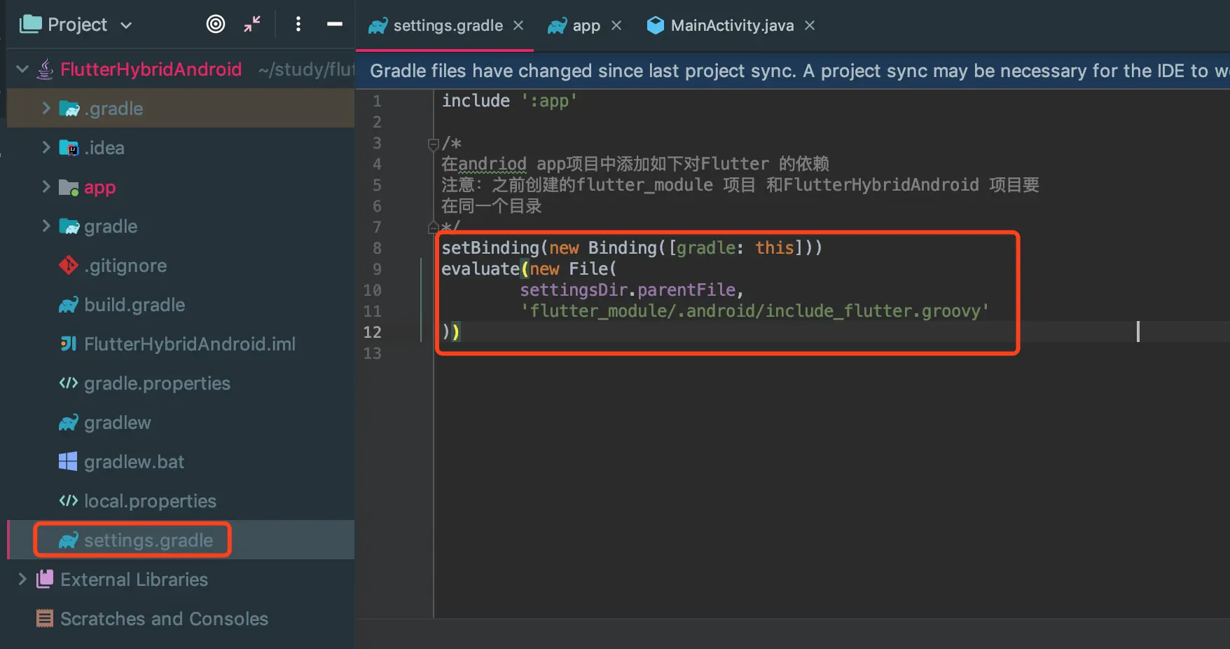 4.修改/Users/xxxx/flutter_hybrid/FlutterHybridAndroid/settings.gradle,在改文件添加如下内容: