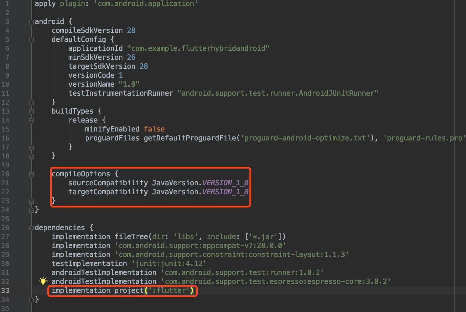 ))5.修改/Users/xxx/flutter_hybrid/FlutterHybridAndroid/app/build.gradle 文件,在该文件添加如下配置: