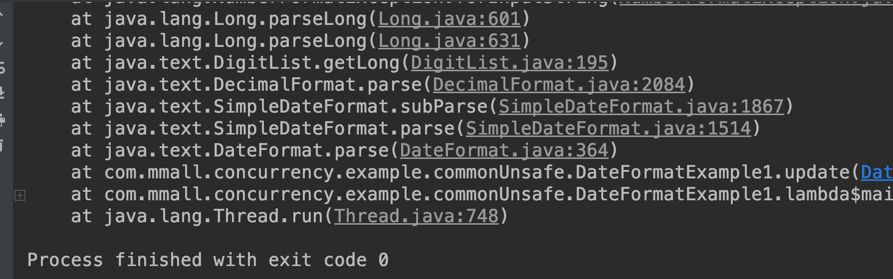 抛出大量异常。因此这种写法是错误的,原因在于SimpleDateFormat 不是线程安全的对象。