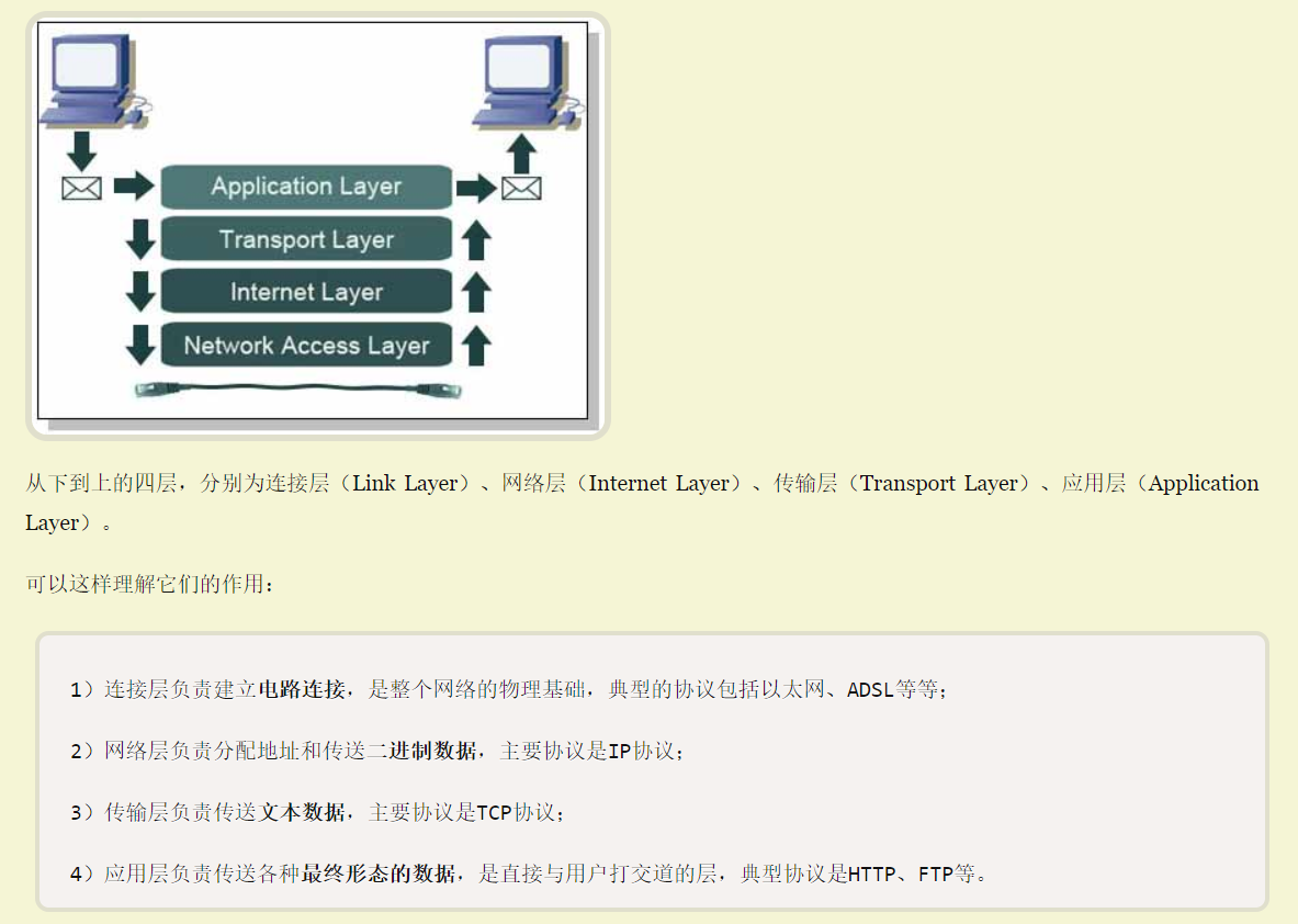 第四层:应用层Application layer。知道了两个设备之间怎么传输,传输的内容很多,计算机上安装的程序很多,传输的内容也不同,比如图片,文字,二进制Raw等等,于是在此基础上规定了各种文件资源传输,如果是互联网传输访问,则需要遵循http/ftp等协议,即需要按照范式(POST.GET等)来操作访问资源。即可以把浏览器看成计算机上安装的多个软件的其中一个,这个软件可以通过http访问特定的资源。 于是下面的图片应运而生。