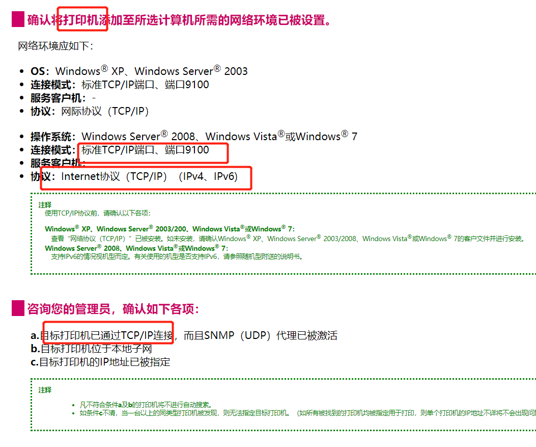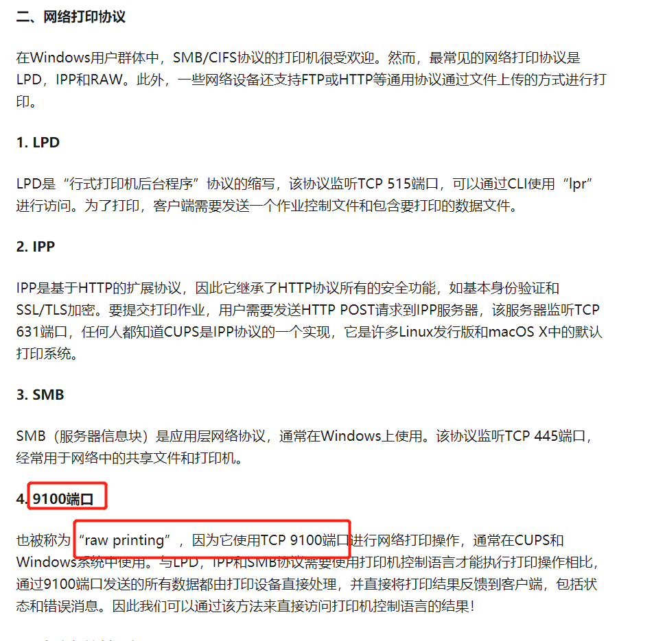看到这里,基本上应该明白,如果我访问一个端对端打印机需要什么协议了,应该在第三层,即Transport layer,即TCP。事实证明也如此,看打印机设置过程: