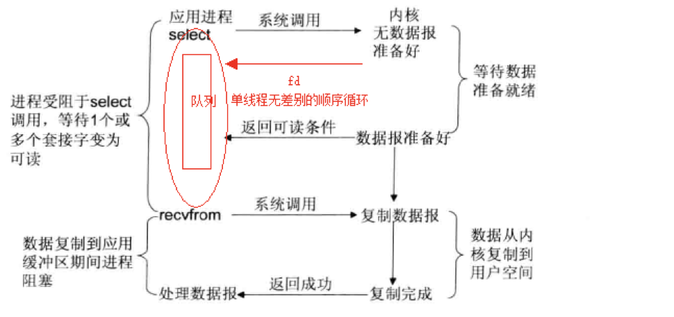 2、fd 类似于一种请求事件(Socket描述符).有一点很重要,这里的select轮询是阻塞的。