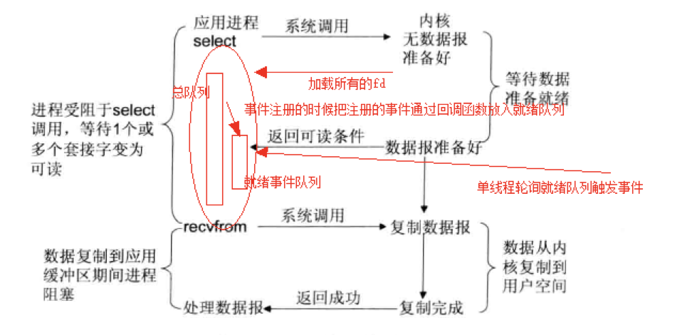 1、select/poll 多路由复用器(这里可以先简单的理解成一个队列,有一个单线程在不断的轮询处理队列里的事件)