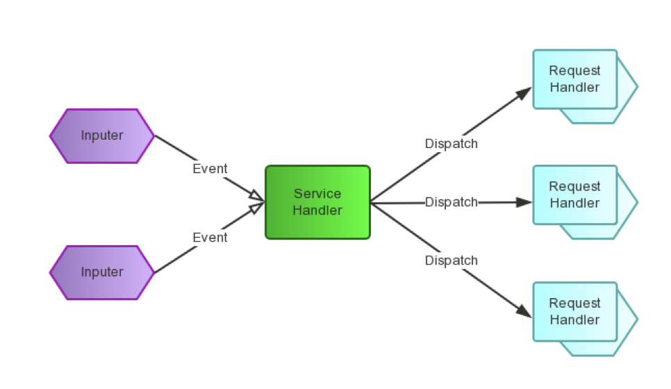 事件驱动模型,有一个或多个并发输入源,有一个Service Handler,有多个Request Handlers