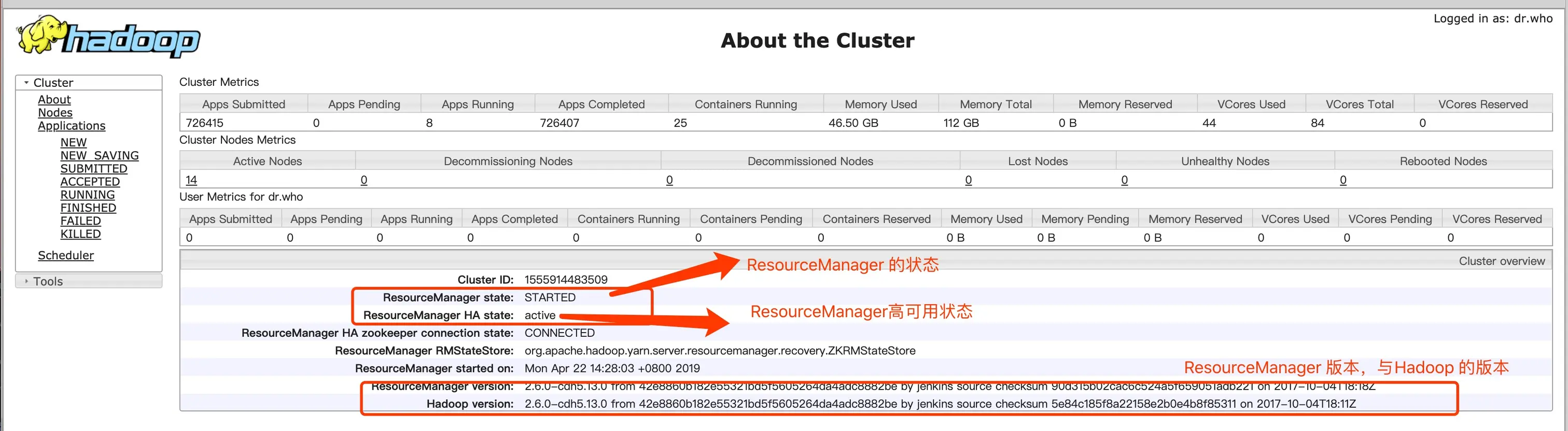 about 菜单里面可以看到 Yarn 的 ResourceManager 的状态,是否是HA,它的版本和Hadoop 的版本信息。