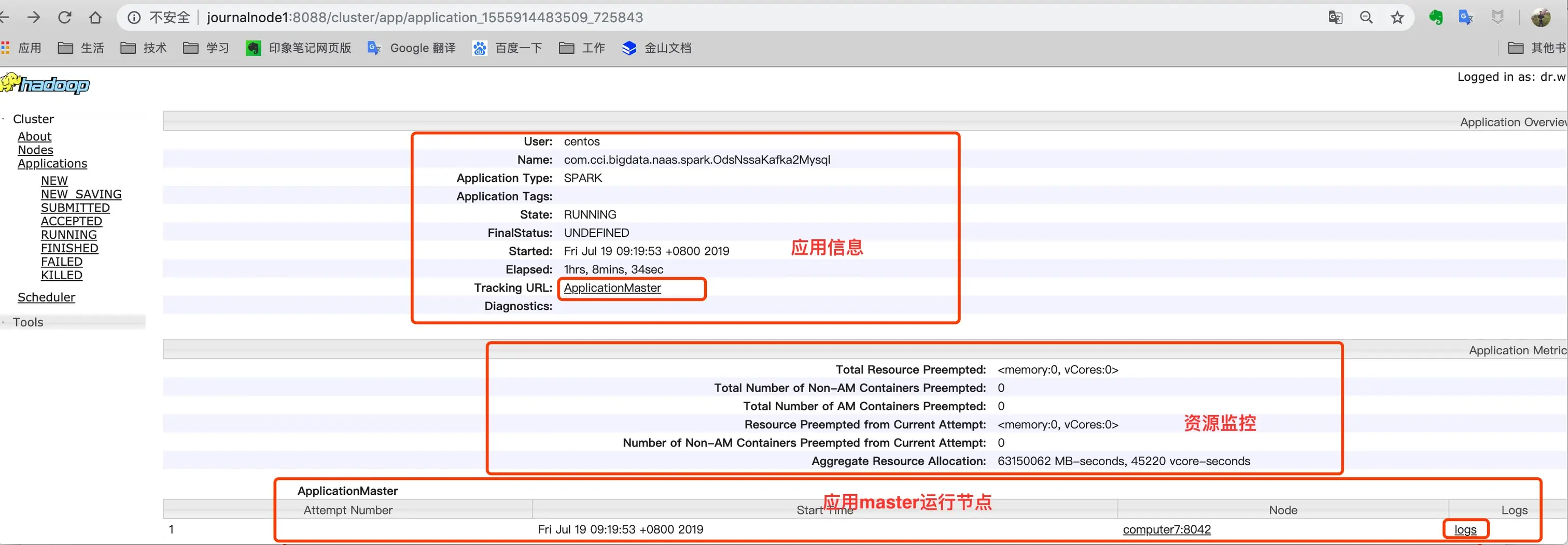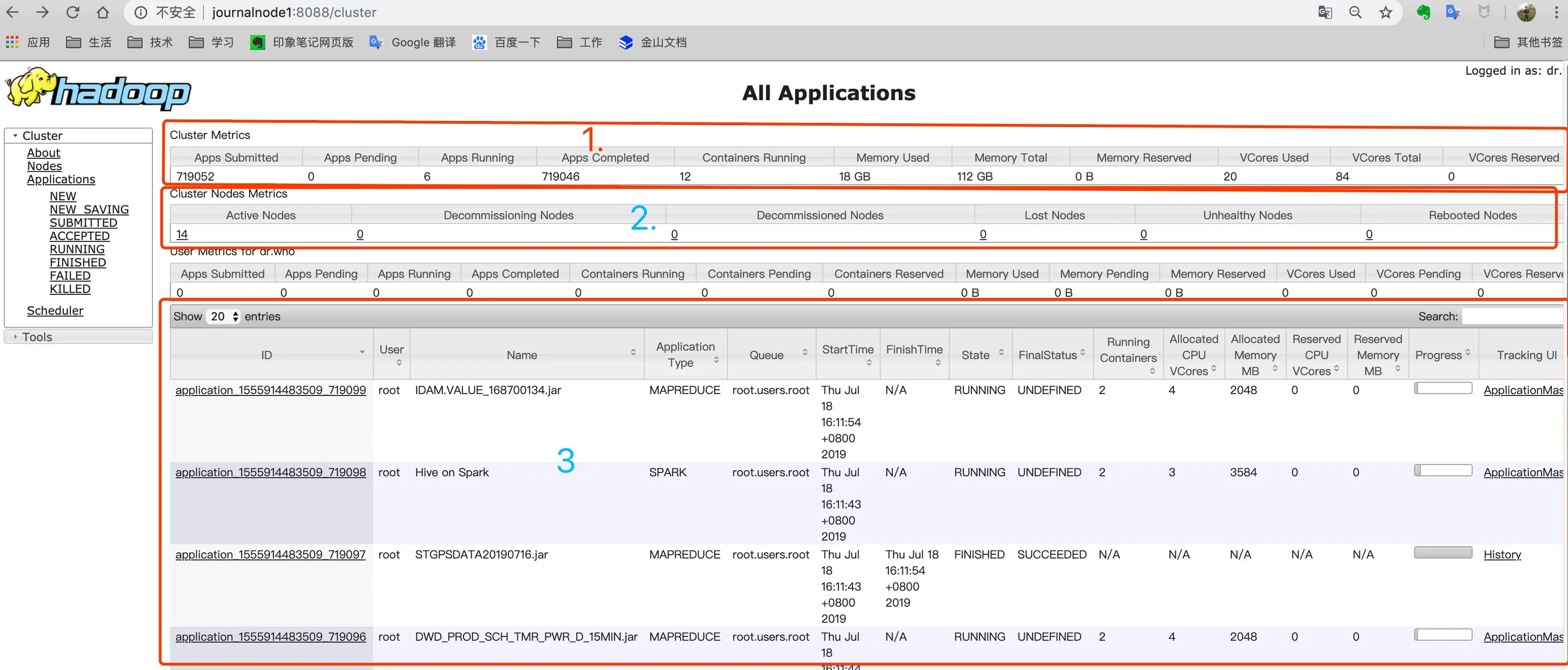 那么我们有木有办法看到 Yarn机器有多少资源呢?内存呀,CPU呀什么的。 我们提交到 Yarn的这些应用,它们的运行状态是什么样子的,占用了多少资源,到底哪些机器在为他们跑任务呢?