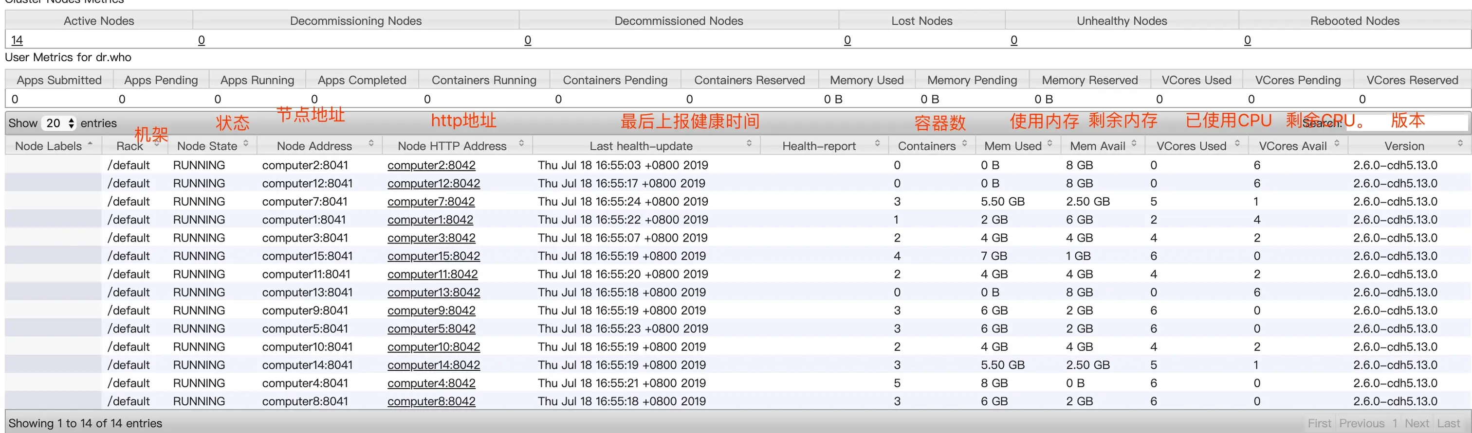 - VCores Reserved 和 Memory Reserved: 为什么会存在预留的情况?是因为 Yarn 为了防止在分配一个容器到 NodeManager 的时候,,NodeManager当前还不能满足,那么 现在 NodeManager 已经有的资源将被冻结,以达到 容器需要的标准,然后分给那个容器。关于这个问答可以看这篇文章What is Memory reserved on Yarn