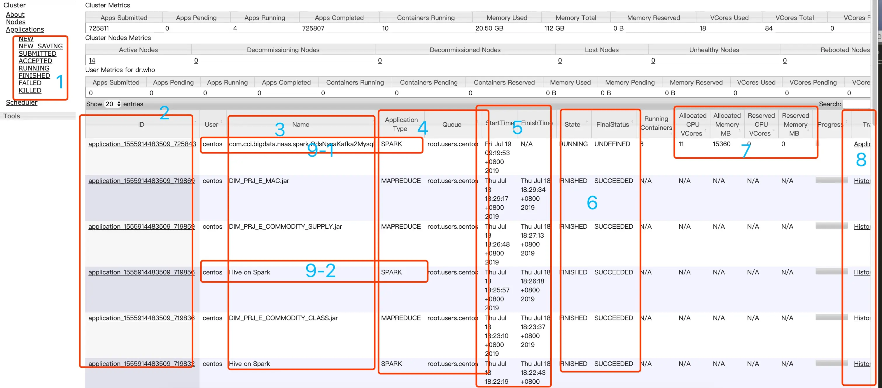 - 第一块,可以根据任务的不同状态去筛选,上图是筛选正在运行的任务。一搬来说,我们就看正在运行(RUNNING)的,和已经运行完成的(FINISHED)。如果你发现没你的任务了,那么可能在已接受( ACCEPTED)还没有运行的状态中,如果还找不到不到,那么恭喜你,可能有问题,跑失败了在失败(FAILED)里面,这时候,你就可点击任务ID,去详情页里面,找到日志入口去查看日志了,找问题了。