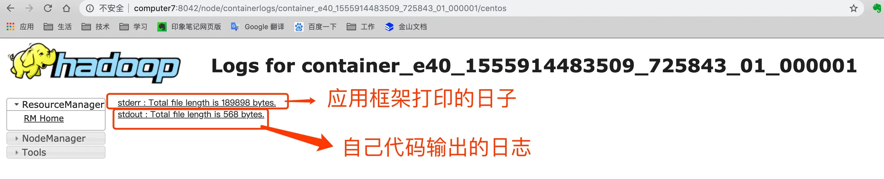 从应用详情页 ApplicationMaster 中,点击 最右边 log ,可以进入到应用的日志页面,日志记录了两部分,一部分是你的应用运行框架打印的日志,比如spark ,另外一部分是你编写的代码中打印的日志。point 打印的日志都会记录。如下图: