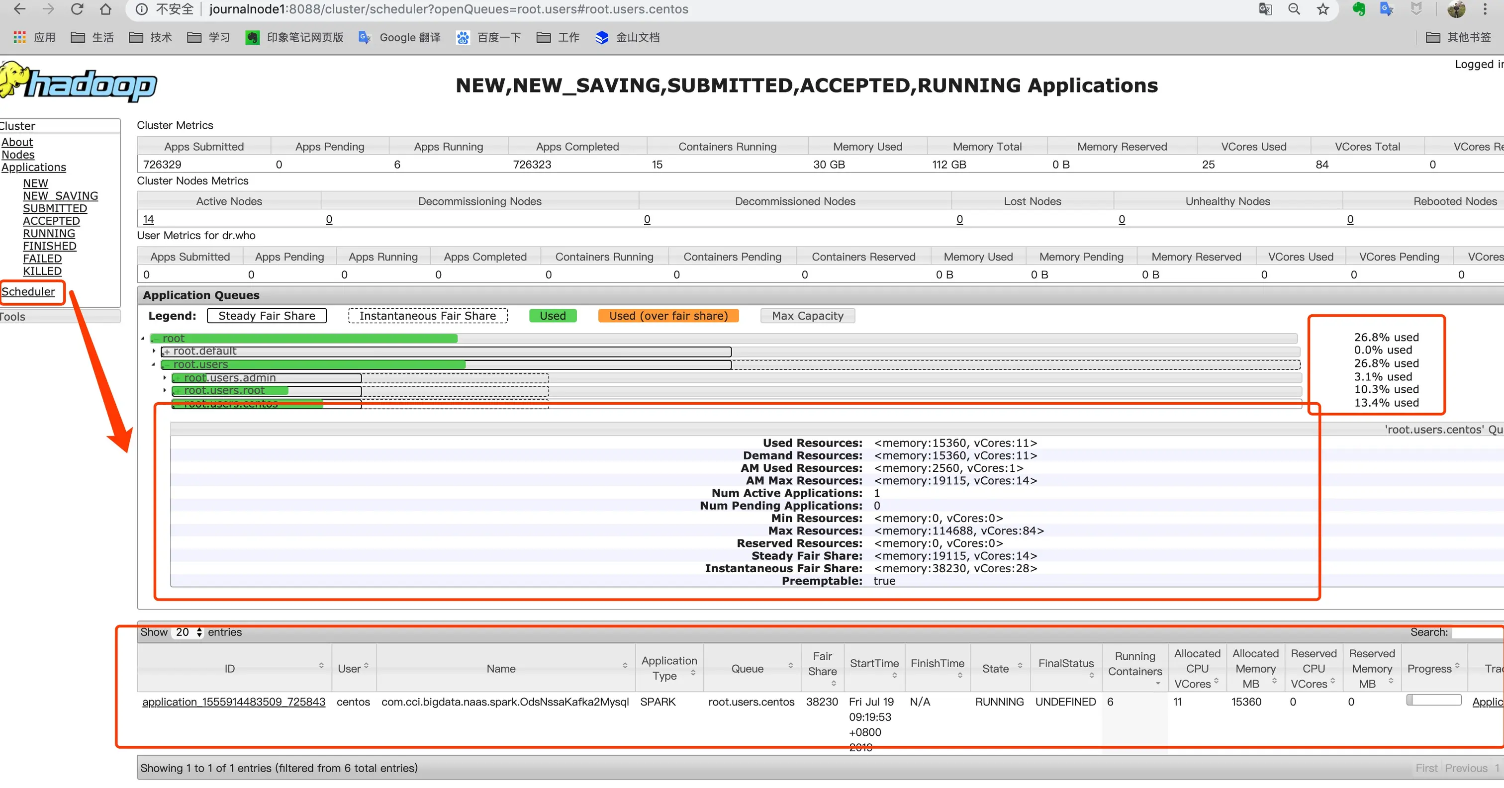 在主页还有一个调度(Scheduler)的菜单,里面可以看到 yarn 的队列信息。包含了有哪些队列、每个队列的资源使用情况、哪些任务运行在这个队列中等等。