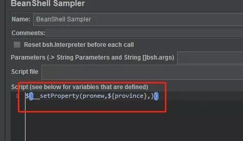 然后,我们开始实施线程组间参数传递,将提取出来的参数添加进jmeter的属性,在这,我们需要引入beanshell调用__setProperty 自带函数来实现添加属性的操作.