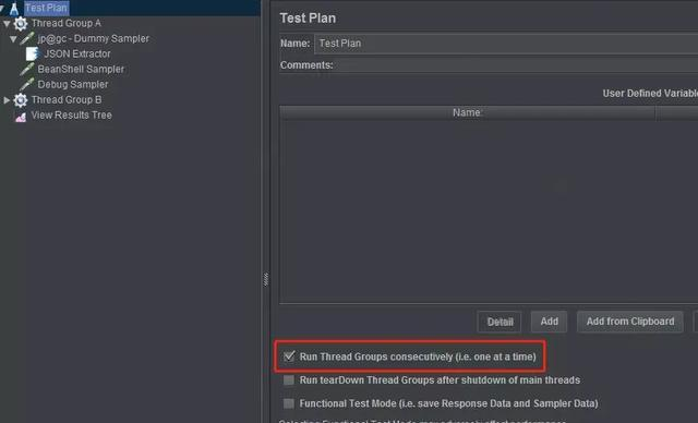 接下来就是在其他线程组中对它进行调用了,在Jmeter中,线程组之间是互不干扰的,为了保证,我们在线程组B中的始终能调用到最新的取值,我们可以在test plan中设置一下,确保先执行线程组A,再执行B