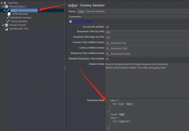 我们在Dummy Sample之后添加一个json后置提取,将省提取出来 $.province[0].name