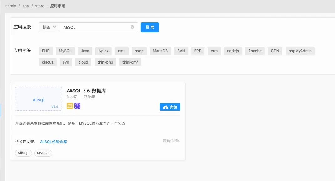 登录URLOS系统后台,在应用市场中选择别名并搜索“AliSQL”,找到之后,选择合适的版本点击安装按钮