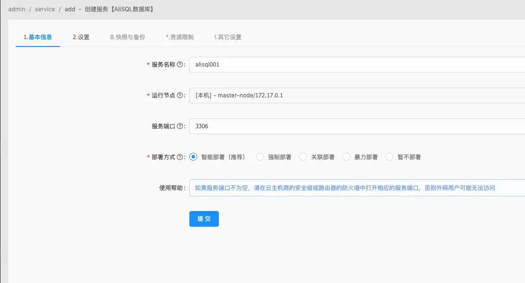 填写服务名称、选择运行节点、服务端口、选择智能部署