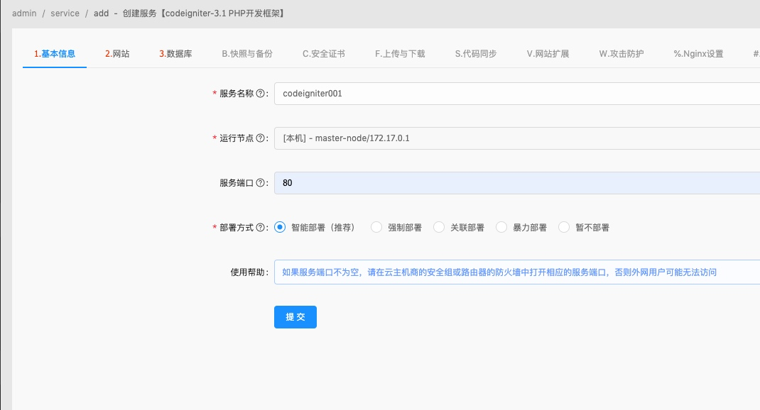 填写服务名称、选择运行节点、服务端口、选择智能部署