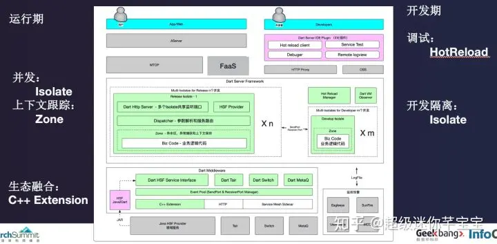- 利用Dart支持的C++ Extension能力,可以在Dart中访问支持了C++的中间件包。另外,Server Mesh也是一个重要的思路,用于解耦异构语言之间的服务调用。