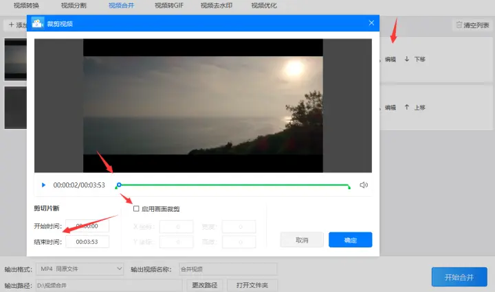 第三步:点击“编辑”进入‘裁剪视频’框,然后需要对视频的区间也就是‘开始时间’和‘结束时间’,在选取区间时可以拖动绿标进行选取。如果需要也可以勾选‘启用画面裁剪’对视频画面的大小进行设置。如果想保存完整视频可以忽略此步骤直接进入下一步骤。