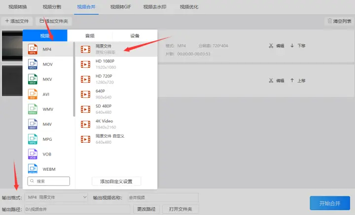 第四步:设置“输出格式”,在设置时又分为输出的‘视频格式’和视频的‘视频分辨率’。由于在视频格式中‘mp4’有着兼容性高且占用内存相对较小等优点所以一般把视频格式设置为‘mp4’格式。而视频分辨率可以设置为和原视频相同分辨率的‘同原文件’格式。