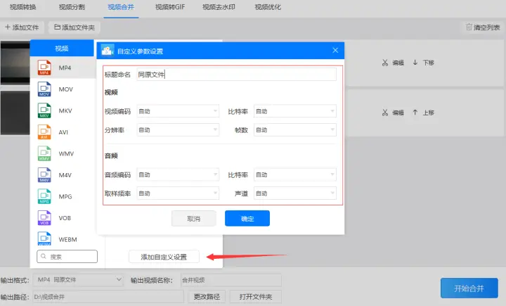 第五步:如果不满足于把“输出格式”设置为‘mp4同原文件’格式也可以点击‘添加自定义设置’自行针对视频格式的视频编码、比特率、分辨率、帧数和音频格式的音频编码、比特率、取样频率、声道进行设置。