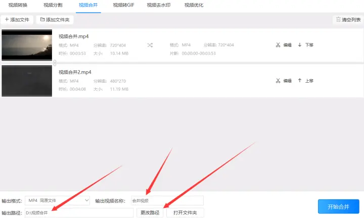 第六步:设置“输出路径”,在设置时可以在输出路径的输入框直接填写视频需要存储到电脑的位置,也可以点击‘更改路径’按钮选择需要预设的存储路径。填写完输出路径可以设置‘输出视频名称’,也可以默认为(合并视频)。