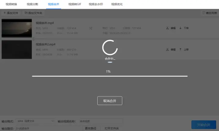 第七步:点击“开始合并”按钮把多个视频合并成一个视频,在合并的会有一个进度条出现,在进度条到100%时就表示视频已经合并好了。最后只需打开之前预设好的输出路径就可以找到转换后的视频合并文件了。