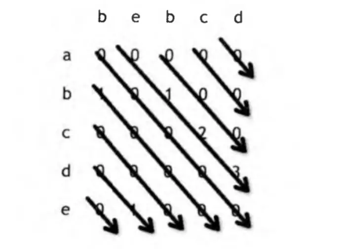 如果 str1=”abcde”,str2=”bebcd”, 计算的 dp 矩阵如下: