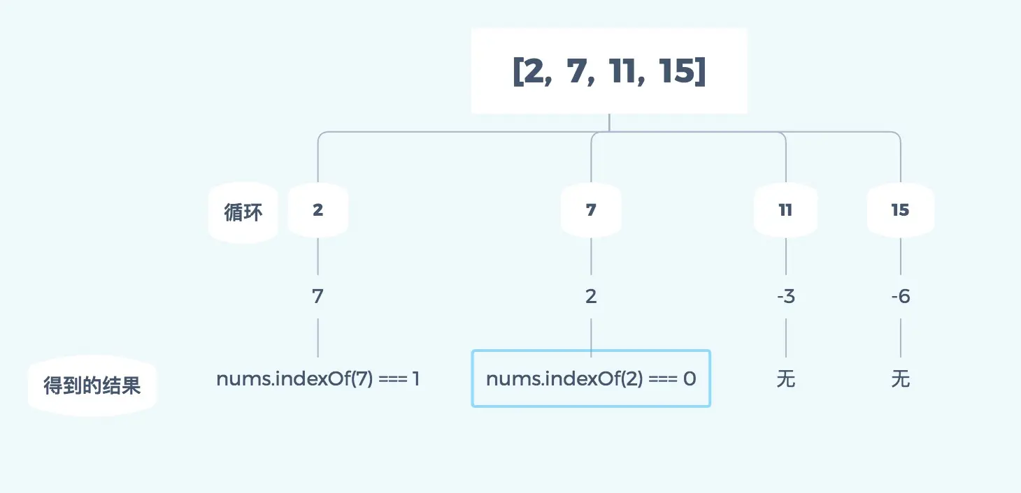 设置一个Set变量,循环nums,获取到(target - nums每一项)的值,并且查看得到的这个结果是否存在于nums中,如果存在则表明当前项与得到的值就是我们想要的结果,并且两项不能一样,所以得到的值要与当前项的index不一样才可以