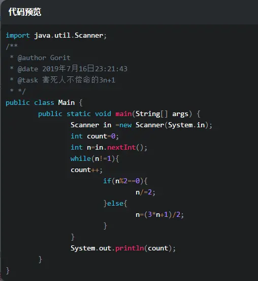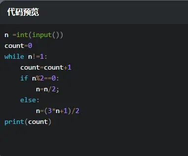 简单来讲,输入一个0 ~ 1000 的数字n,然后进行除法运算,是偶数就直接除以二,不是偶数,也就是奇数,将这个数字乘以3 再加 1 之后得到值 除以 2,反复以往,直到 n==1 的时候,把每次运算的步骤的次数记下来即是结果