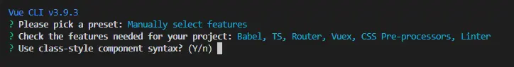 这里我准备做一个vue-ts学习笔记,后面还会继续学习如何在TypeScript中使用 vuex 和router,所以选择 Babel, Typescript, Router, Vuex, CSS Pre-processors, Linter/ Formatter 这几项就可以了。
