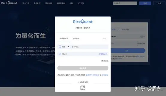目前很多量化交易平台的语言都支持Python,下面我就以米筐(RiceQuant)为例,带你生成一个简单的量化交易策略。下图就是米筐的首页,点击右上角的登录,可以通过手机验证码的方式进行快速,也可以通过下边的微信登录。