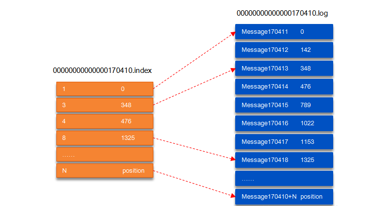 以上面的 segment 文件为例,展示出 segment:00000000000000170410 的 “.index” 文件和 “.log” 文件的对应的关系,如下图: