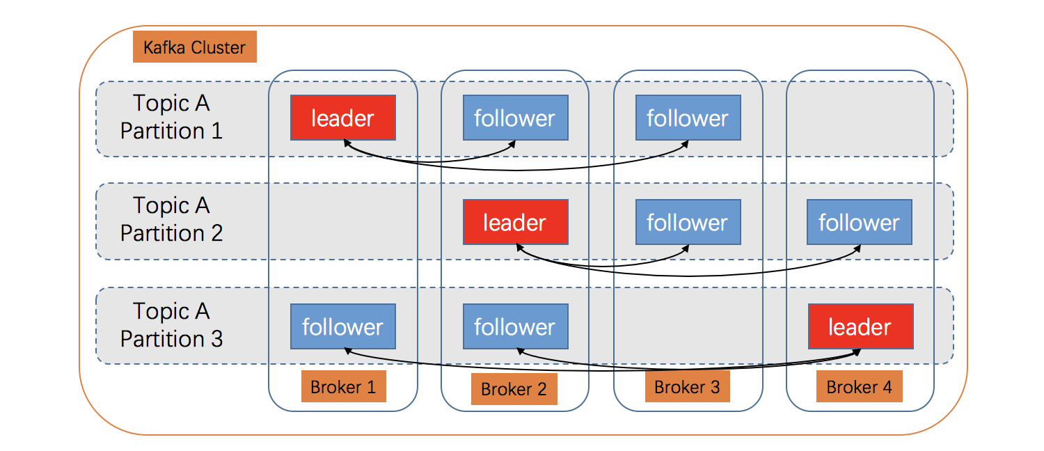 言归正传,为了提高消息的可靠性,Kafka 每个 topic 的 partition 有 N 个副本(replicas),其中 N(大于等于 1)是 topic 的复制因子(replica fator)的个数。Kafka 通过多副本机制实现故障自动转移,当 Kafka 集群中出现 broker 失效时,副本机制可保证服务可用。对于任何一个 partition,它的 N 个 replicas 中,其中一个 replica 为 leader,其他都为 follower,leader 负责处理 partition 的所有读写请求,follower 则负责被动地去复制 leader 上的数据。如下图所示,Kafka 集群中有 4 个 broker,某 topic 有 3 个 partition,且复制因子即副本个数也为 3: