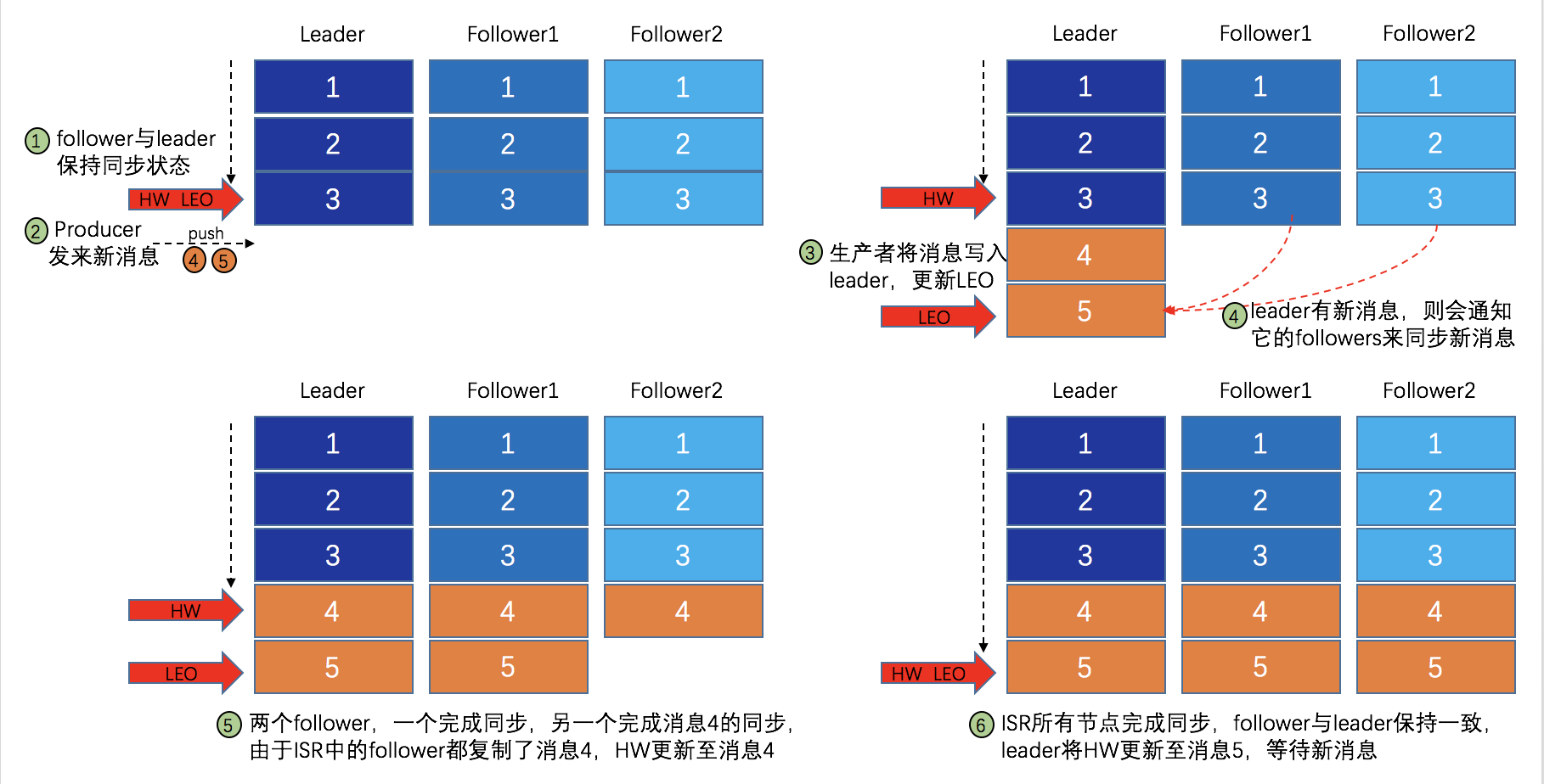 下图详细的说明了当 producer 生产消息至 broker 后,ISR 以及 HW 和 LEO 的流转过程: