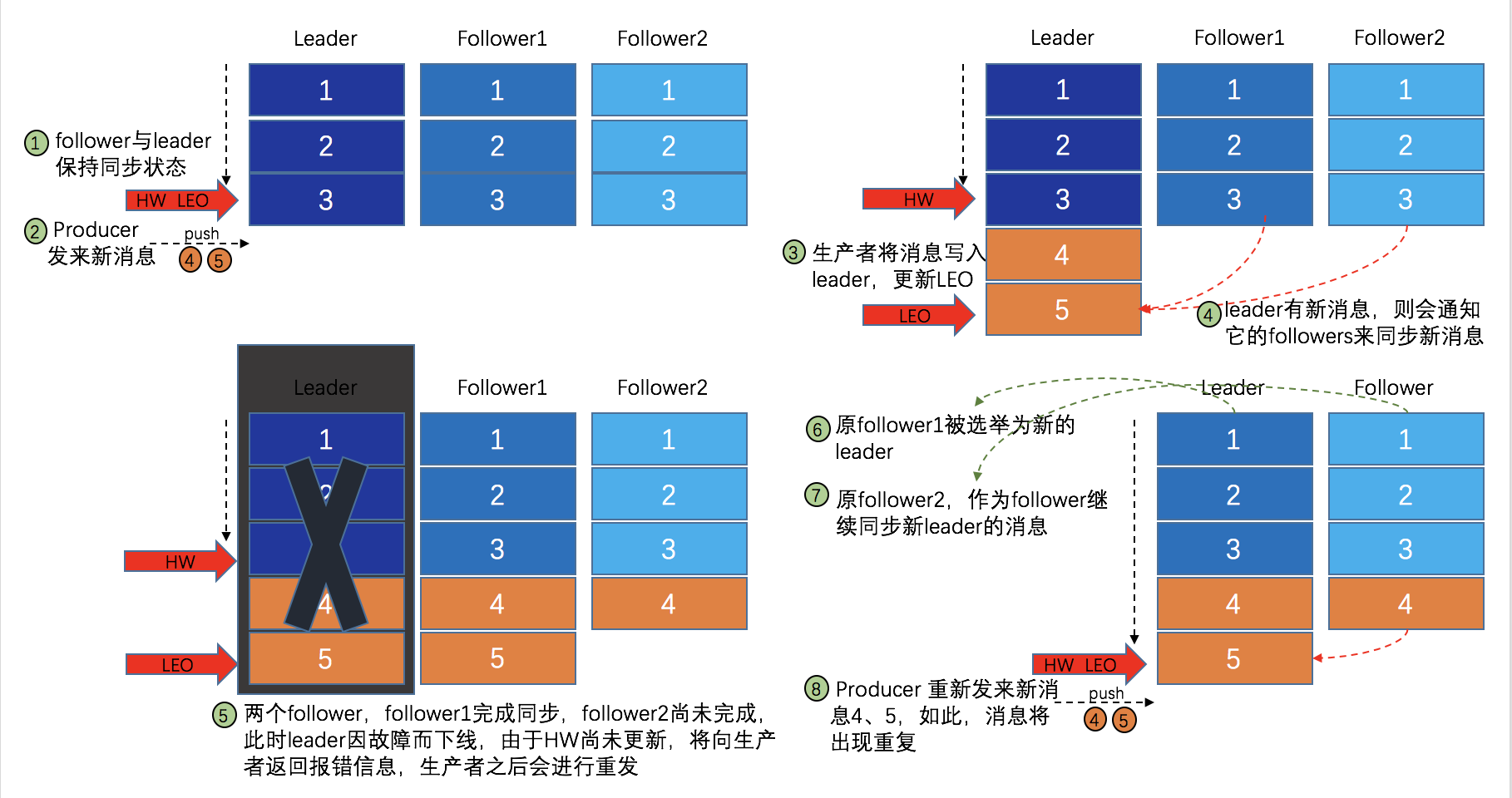 如果失败的 follower 恢复过来,它首先将自己的 log 文件截断到上次 checkpointed 时刻的 HW 的位置,之后再从 leader 中同步消息。leader 挂掉会重新选举,新的 leader 会发送 “指令” 让其余的 follower 截断至自身的 HW 的位置然后再拉取新的消息。
